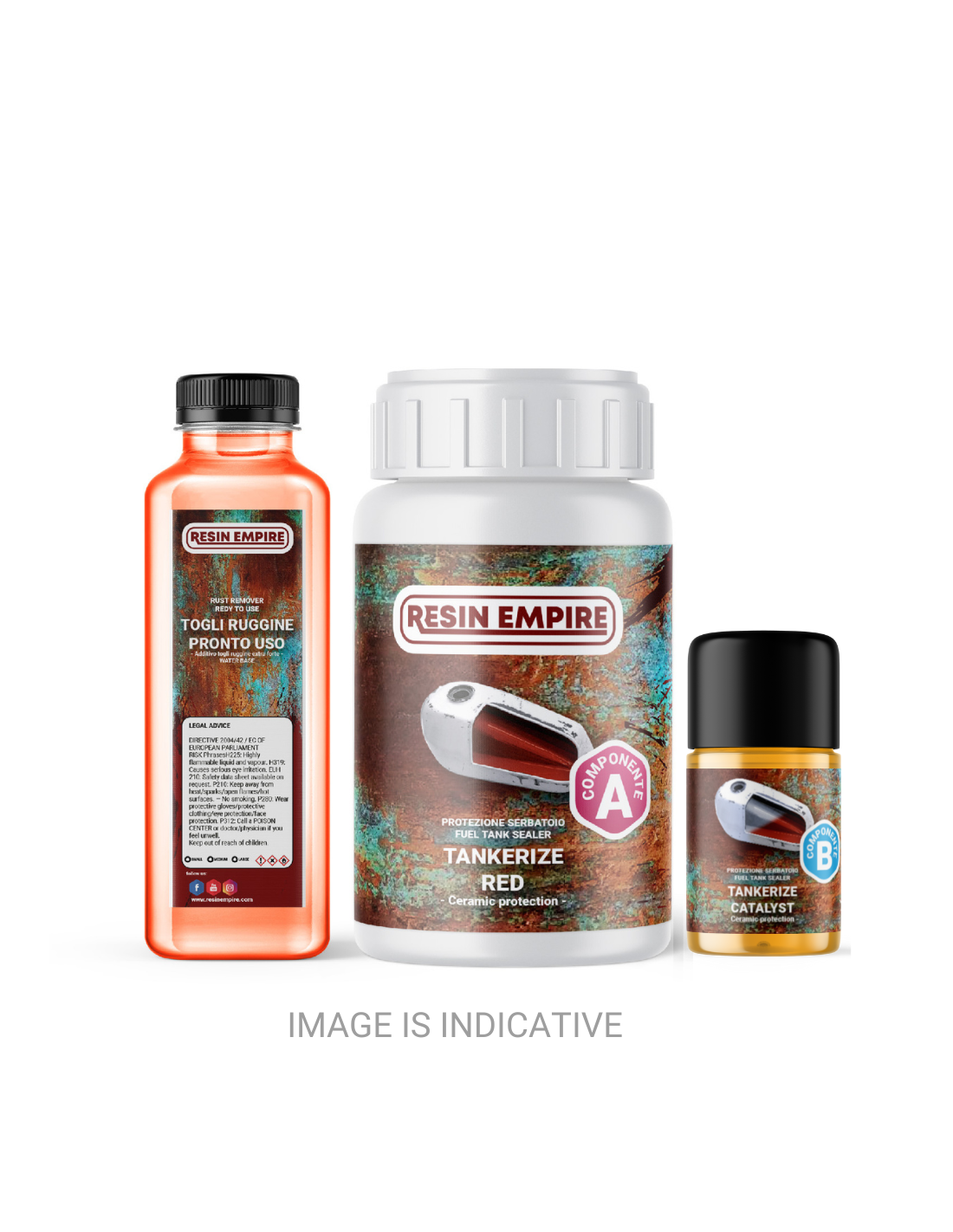 La premisa es que proporcionamos en el kit una botella de ácido concentrado muy potente. Eso hay que diluirlo y eso es suficiente silenciosamente para eliminar el óxido de las condiciones medias que luego es el de la mayoría de los tanques de la motocicleta. Sin embargo, si el óxido está incrustado, entonces una sola botella puede no ser suficiente y, por lo tanto, será bueno comprar otra. Esto se debe a que el tratamiento antioxidante debe realizarse varias veces y no una sola vez.