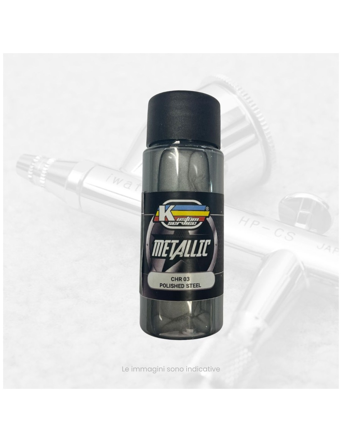NOTA se applichiamola vernice CHR03 su un colore bianco con un trasparente lucido KSW100 otteniamo effetti di metallo più chiaro e più vicino all'acciaio, se invece lo applichiamo sulla base nera lucida KSW100 black otteniamo effetti più simili all' acciaio cromato ma con un tono più scuro e metallico.