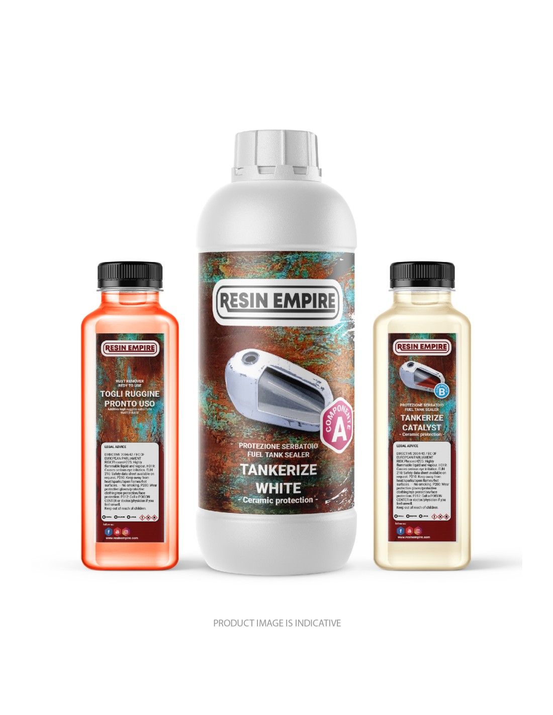 Prodotto ceramico ad elevata resistenza chimica contro benzina, oli, grassi, agenti corrosivi. Kit medio bianco per serbatoio da 20/25 litri